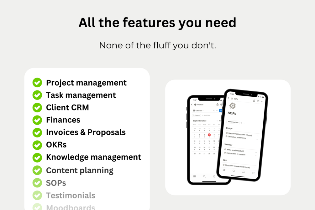This is more than a Notion template. It's an all-in-one dashboard that helps you manage all aspects of your business, so that running it feels enjoyable and not like a chore. This tool is the most downloaded template I've ever built, adopted by over 100 freelancers like you.