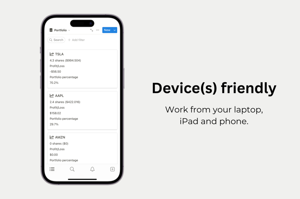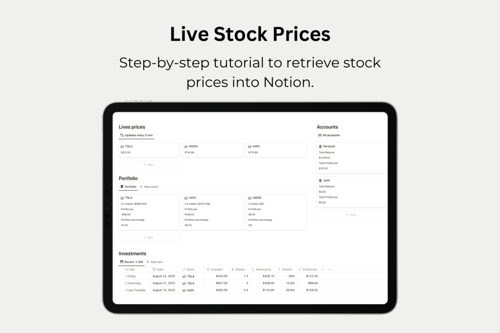 Use this Investment Tracker Notion template to get live stock prices into Notion and track your portfolio like a pro.