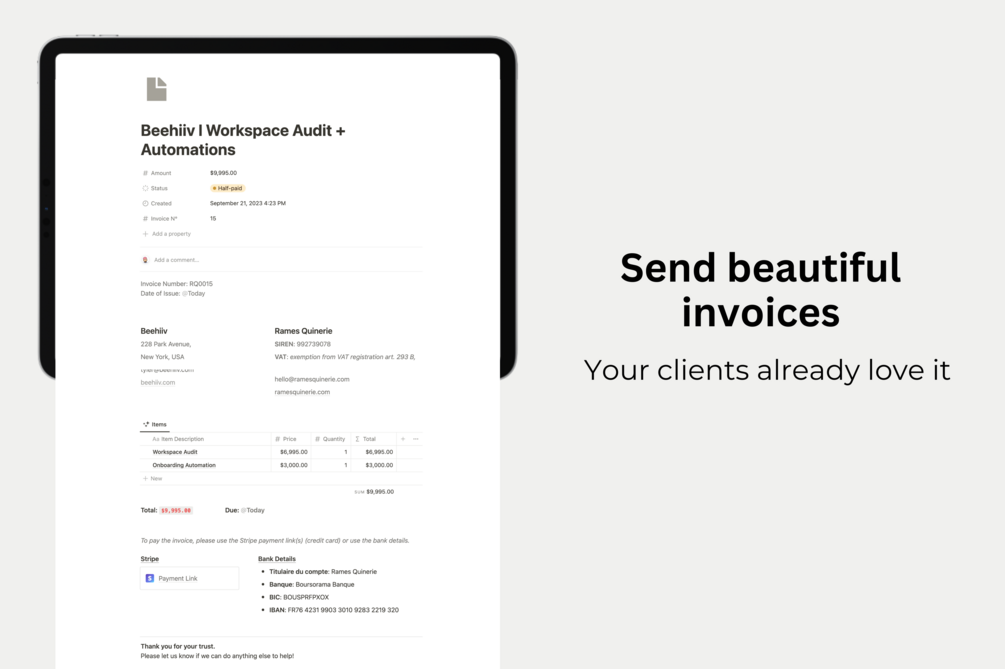 Invoices are a simple, yet super important part of any business. And if you’re a freelancer, it’s really important that you find the best way to easily create, send & store invoices. Some platforms allow you to create invoices, but why pay for a new tool when you can get them done in your favorite app.