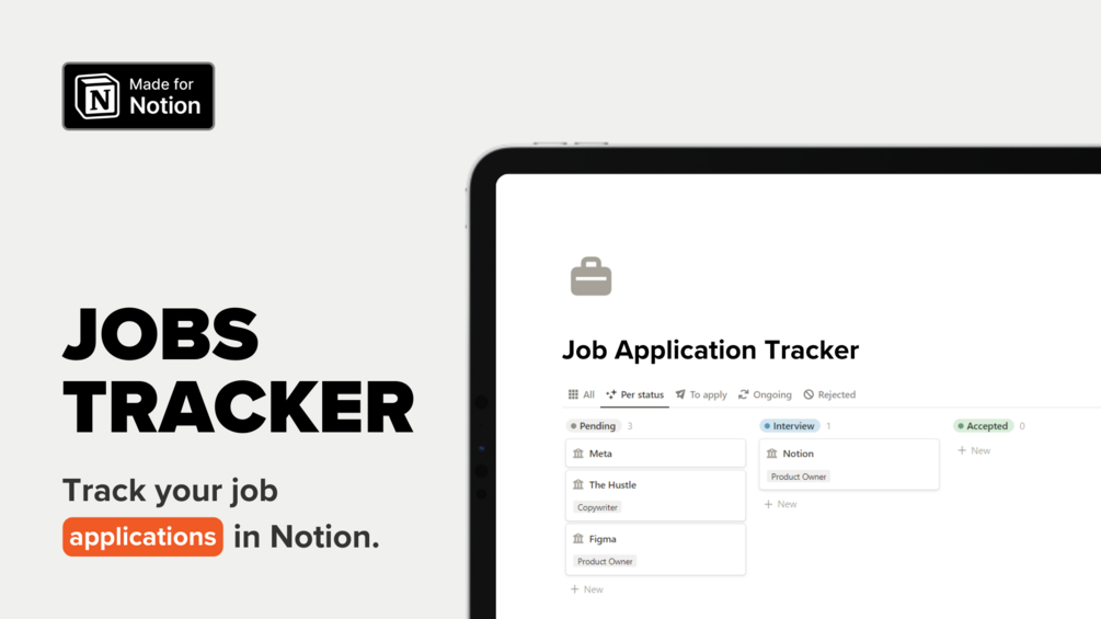 The Jobs Dashboard is a simple Notion template that allows you to keep track of all your job applications to help you better process them, and measure progress. Applying to jobs can quickly become messy, so stay organized with this easy-to-use template.