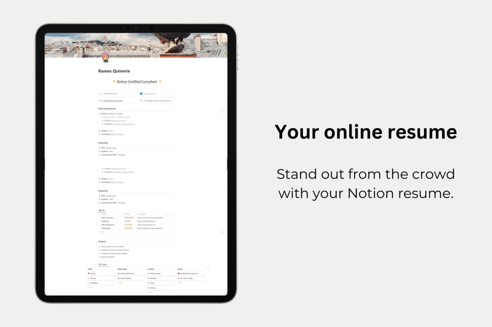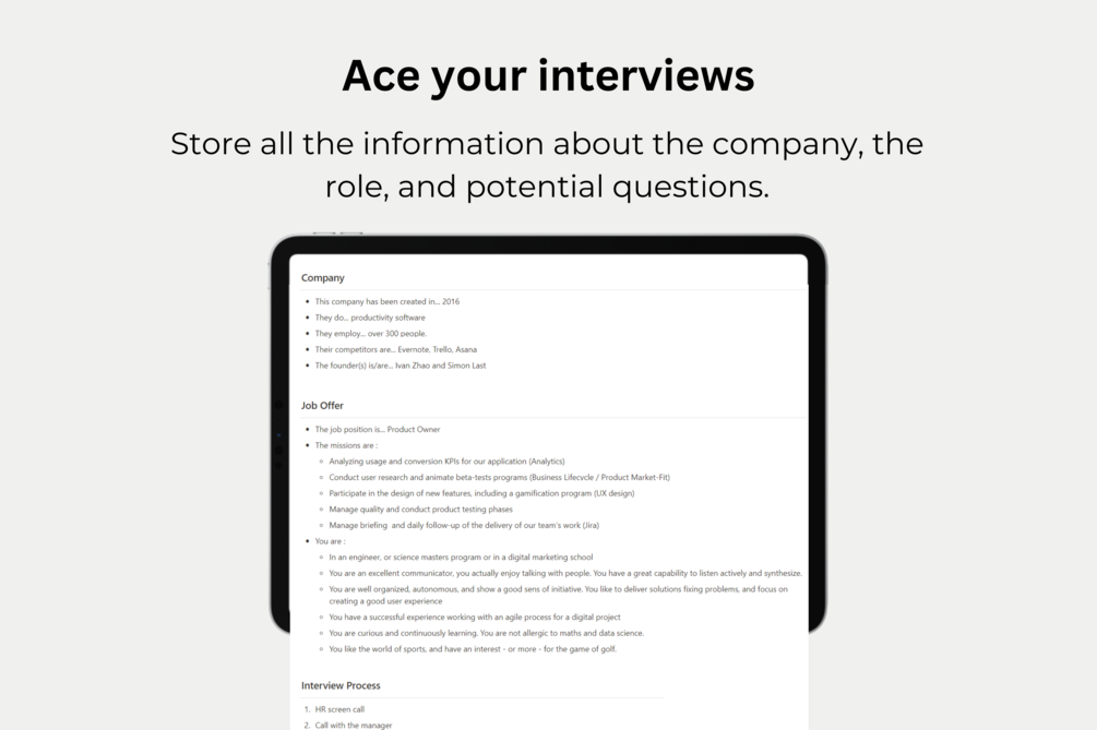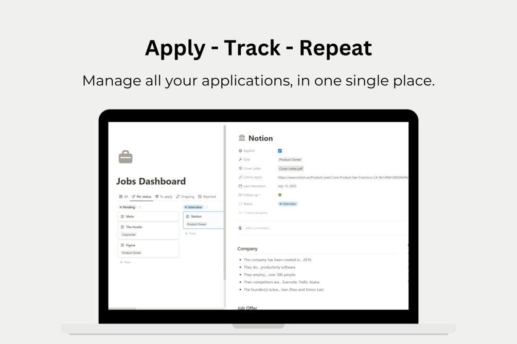 With this free Notion Template, you'll be able to track all your job applications, ace your interviews, and build your online resume.