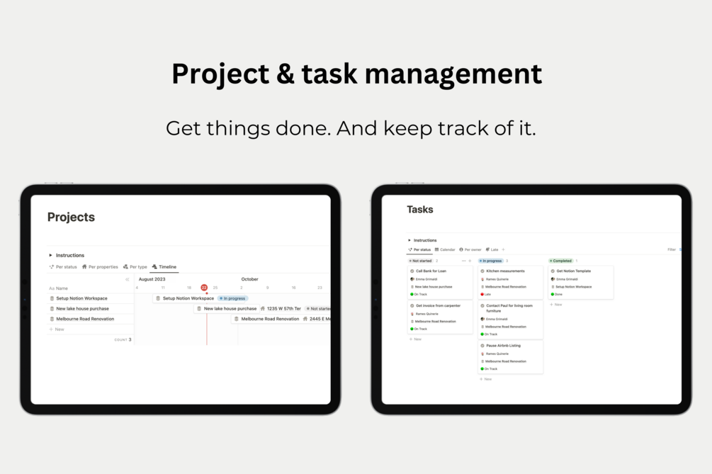 - Tasks: Linked to the Projects database, this is your go-to place for any real estate-related actions. You can assign team members, see which tasks are late, and follow the progress. Includes multiple views: Kanban, Calendar, Per Owners, and Late Tasks.