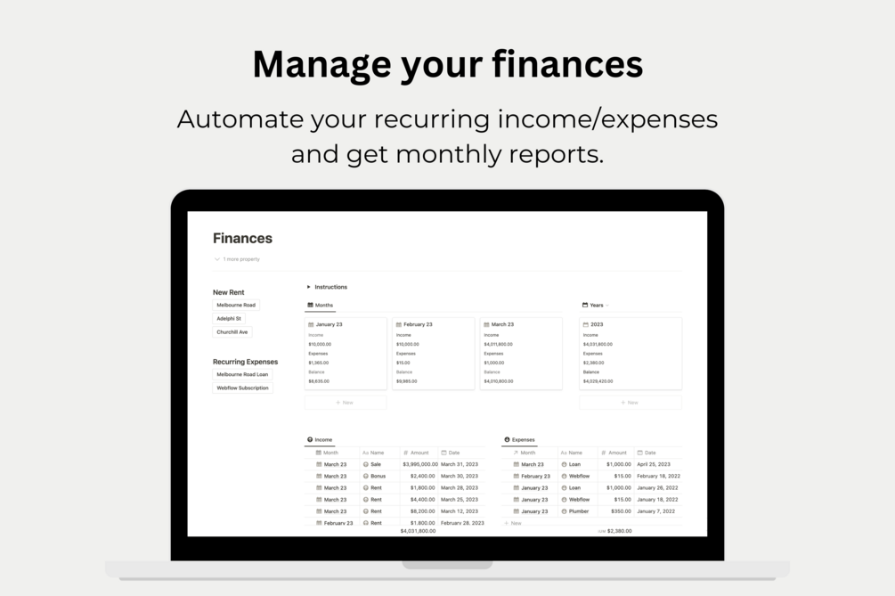 - Finances: Composed of four databases, this is your central hub for everything money-related. You can add your expenses and income on the go, and it will automatically calculate your monthly and yearly balance. There are buttons for recurring items such as rents, loans, and subscriptions.