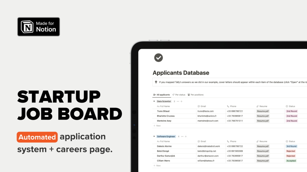 The automated application system enables candidates to easily apply for any job opening by filling out a simple form, on your website. Once submitted, their application will be automatically added to the Notion backend, where recruiters can efficiently sort and filter applications based on various criteria, then follow the hiring process.
