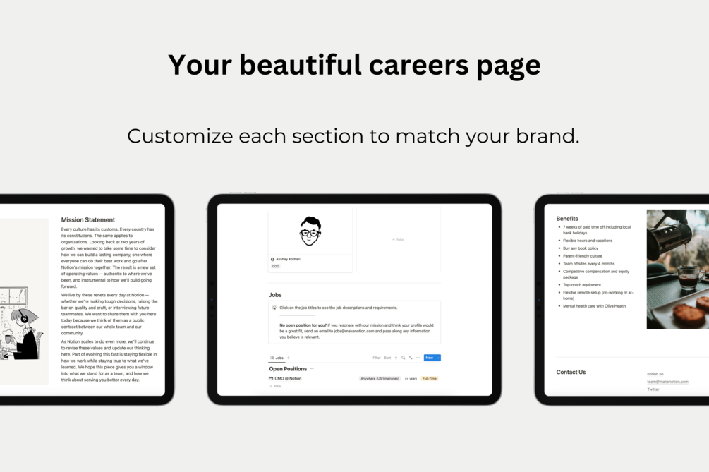 • Beautiful careers page website with mission statement, meet the team, benefits, etc.
